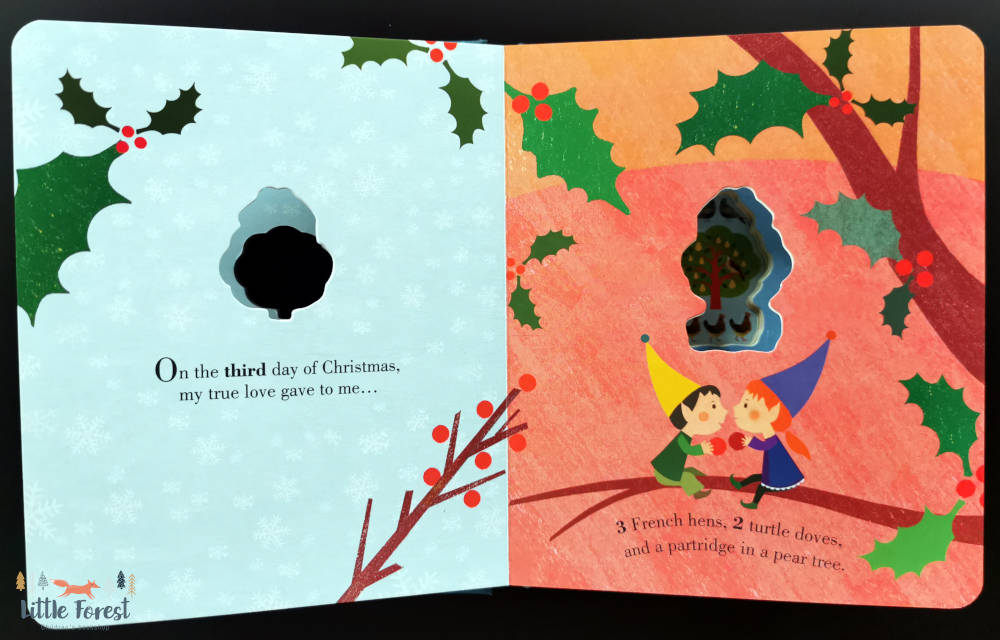 There are two points of difference with this version of the twelve days. Firstly every page contains a peep hole which culminates in the final resolution where we see all the gifts. Secondly this is the first version that I have explored which uses numerals for the numbers which gives the text a counting book feel.